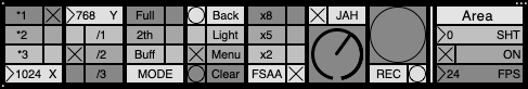 DOWNLOAD [1.1-0] - Area is the Gem's window output for your video data stream. You can select different aspects of the video formats in accordance with the output device that uses, the full-screen option - in the first or second screen -, the antialiasing option, buffering with clear control and a pseudo 3D effect. The last but not the least feature is the shooting possibility (by .jpg file). You can modulated the parameter of 3D effect with the (e.g.) Onde's module and shot image via external audio source by Manda or other trigger modules. |