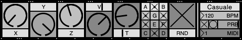 DOWNLOAD [1.1-1] - Casuale is an MIDI mono random sequencer. You can play a sequence by a trig probability and synchronize the parameters of Octave, Velocity, Length, Time (with Divider and Multiplier) and Step-multiplier. Casuale work by internal clock in BPM, manual button or by another trigger pDd's modules. You can play via MIDI the external instruments or other pDd's modules (like Retrò). You can modulated separately any control with the (e.g.) Onde's module and trig a sequence via external audio source by Manda or other trigger modules. |