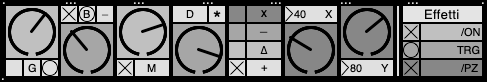 DOWNLOAD [1.1-1] - Effetti is a multi effect module that allows you to manage a video source with five cascade filters: Gain, Backlight, Motion Blur, Delay and Puzzle. You can modulated separately all parameters with the (e.g.) Onde's module and with your external audio source by Manda or other trigger module or other trigger module. |