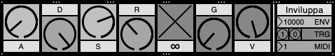 DOWNLOAD [1.1-0] - Inviluppa is a simple MIDI envelope (like ADSR) generator and it's perfect for playing your external instruments or other pDd's modules. You can also play the Inviluppa via external MIDI keyboard. It's possible to modulated any control separately (Attack, Decay, Sustain, Release, Glide and Velocity with the (e.g.) Onde's module or via external audio source and trig the envelope via external audio source by Manda or other trigger modules.. . You can play via MIDI-OUT the external instruments or other pDd's modules (like Retrò). |