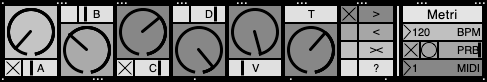DOWNLOAD [1.1-2] - Metri is an MIDI time sequencer. You can put in sequence four time variables to four steps and control them by Velocity, Length, Time (with Divider and Multiplier), Directions and Step-probability. Metri work by internal clock in BPM, external MIDI instrument or by another trigger pDd's modules. You can play via MIDI-OUT the external instruments or other pDd's modules. You can modulated separately any control with the (e.g.) Onde's module or via external audio source. |