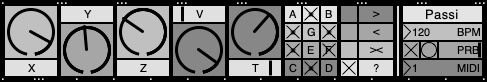 DOWNLOAD [1.1-2] - Passi is an MIDI mono sequencer. You can put in sequence from one to twelve semitones with an interval of two to twelve steps and control them by Octave, Velocity, Length, Time (with Divider and Multiplier), Step-multiplier, Directions and Step-probability. Passi work by internal clock in BPM, manual button or by another trigger pDd's modules. You can play via MIDI the external instruments or other pDd's modules (like Retrò). You can modulated separately any control with the (e.g.) Onde's module and trig a sequence via external audio source by Manda or other trigger modules. |